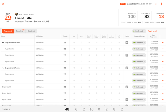 Once you've updated a request status to either Confirmed or Denied, the system automatically sends an email to the team member who submitted the request, informing them whether their ticket request for the event has been approved or denied.