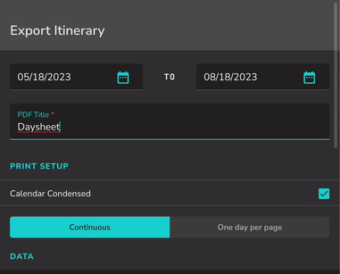 Artist Growth automatically generates PDF itineraries and day sheets using information from your events. You can customize date ranges and select which event types to include.