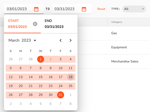 Users can easily navigate through their financial history, such as viewing all expenses and revenue from March 1 to April 8, 2023, giving you precise control over your financial reporting and analysis