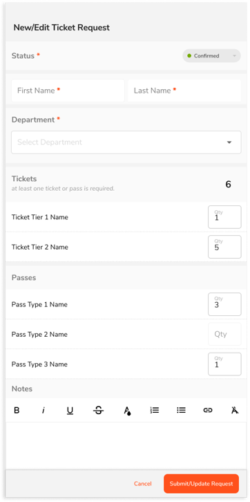 When your team members request tickets for events with configured tiers, they'll see these tier options in a selection window. This same window also appears when you edit existing ticket requests by clicking the three dots next to a team member's request and selecting Edit Request.