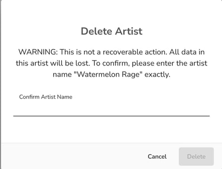 ⚠️ Important Warning: Deleting an artist is permanent and irreversible. All associated data (events, schedules, contacts, files, etc.) will be permanently lost. Make sure you won't need this information before proceeding.