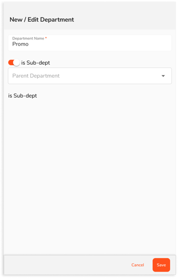 - For Sub-Departments: You can indicate if this department is a sub-department by tapping on the is Sub-dept toggle, and finding the parent department you want it to be associated with from the drop-down menu
